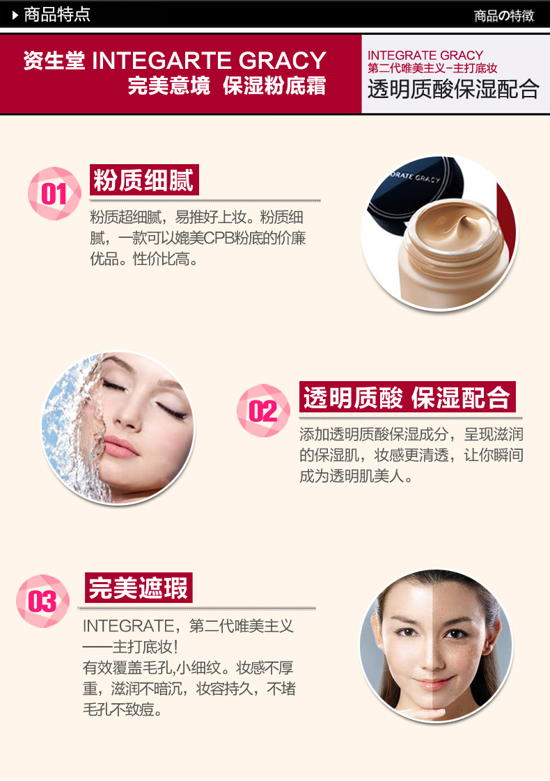★有效覆盖毛孔,小细纹,妆感不厚重,长时间完美保持妆感,呈现滋润的保湿肌, 透明质酸成